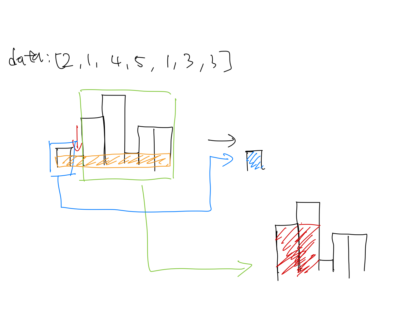 현재스택에서 자기자신보다 작은 값이 왔을경우 지금까지 만들 수 있는 모든 직사각형의 넓이를 구하여 최대 넓이 값이 반영해야한다. 그림으로 표현하면 아래와 같다.