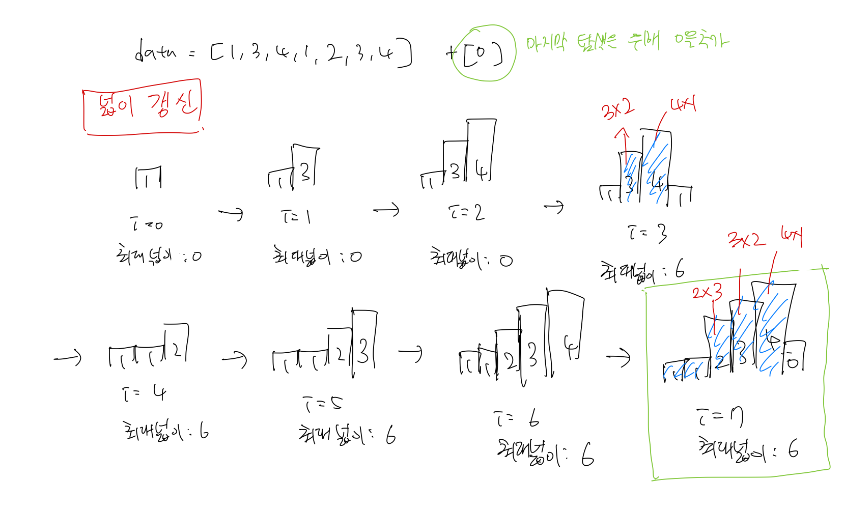 초록색 : 마지막에 0을 넣음으로, 마지막에 모든 스택을 pop 시켜, 넓이의 값을 갱신시킨다.