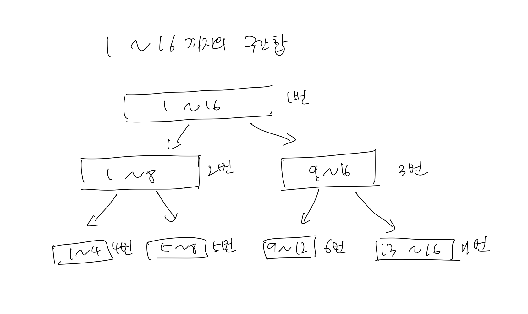 이런식으로 재귀호출하여 문제를 해결합니다. 여기서 구간을 반반으로 나누어 가면서 조건에 따라서 재귀 호출 합니다.