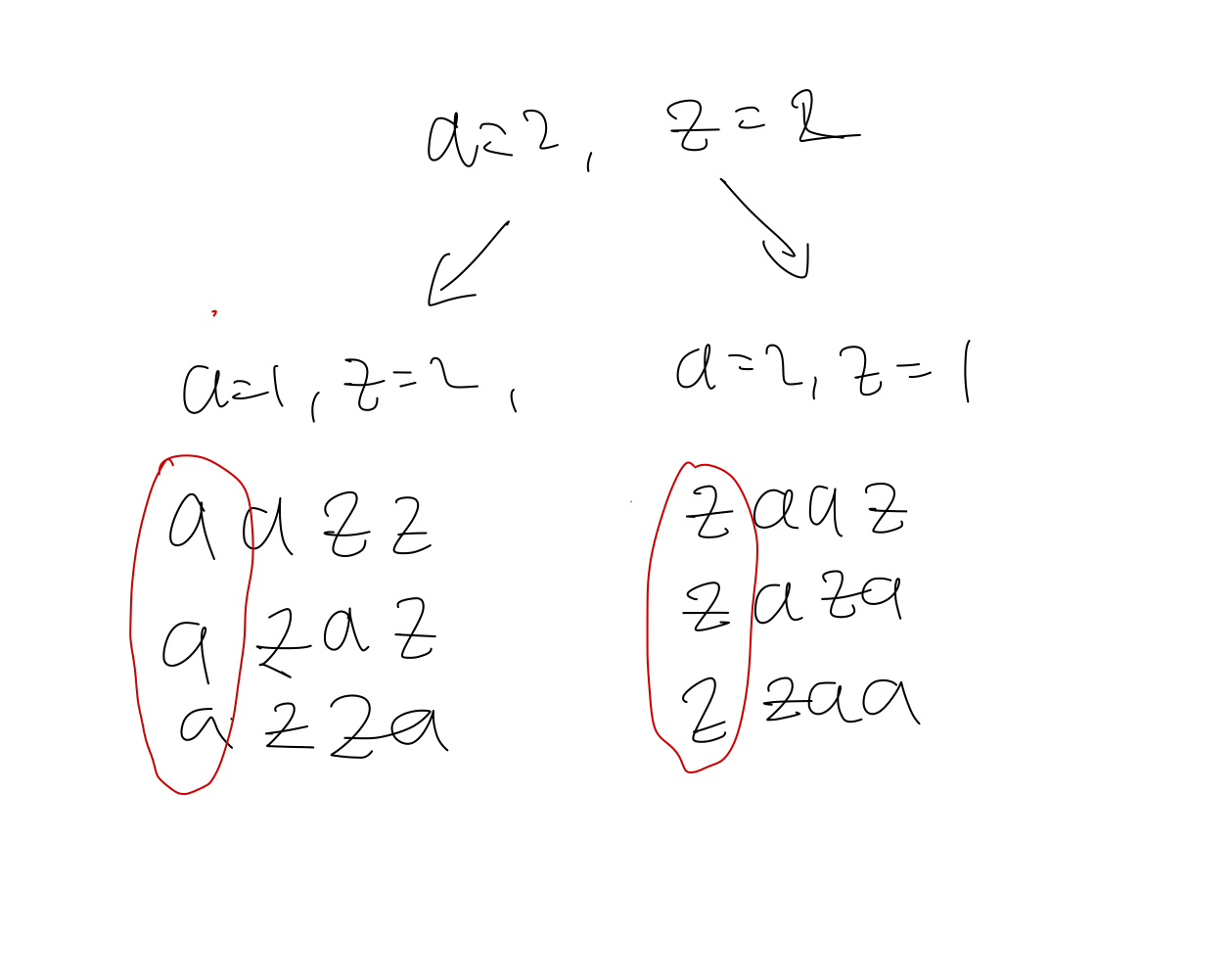 해당문제는 다이나믹 프로그래밍을 역추적 하는 방법으로 문제를 해결 할 수 있습니다. 경우의 수 점화식은 아래와 같이 만들 수 있습니다. 앞에 ‘a’ 가 추가된경우, 앞에 ‘z’가 추가된경우를 둘다 더한값입니다.