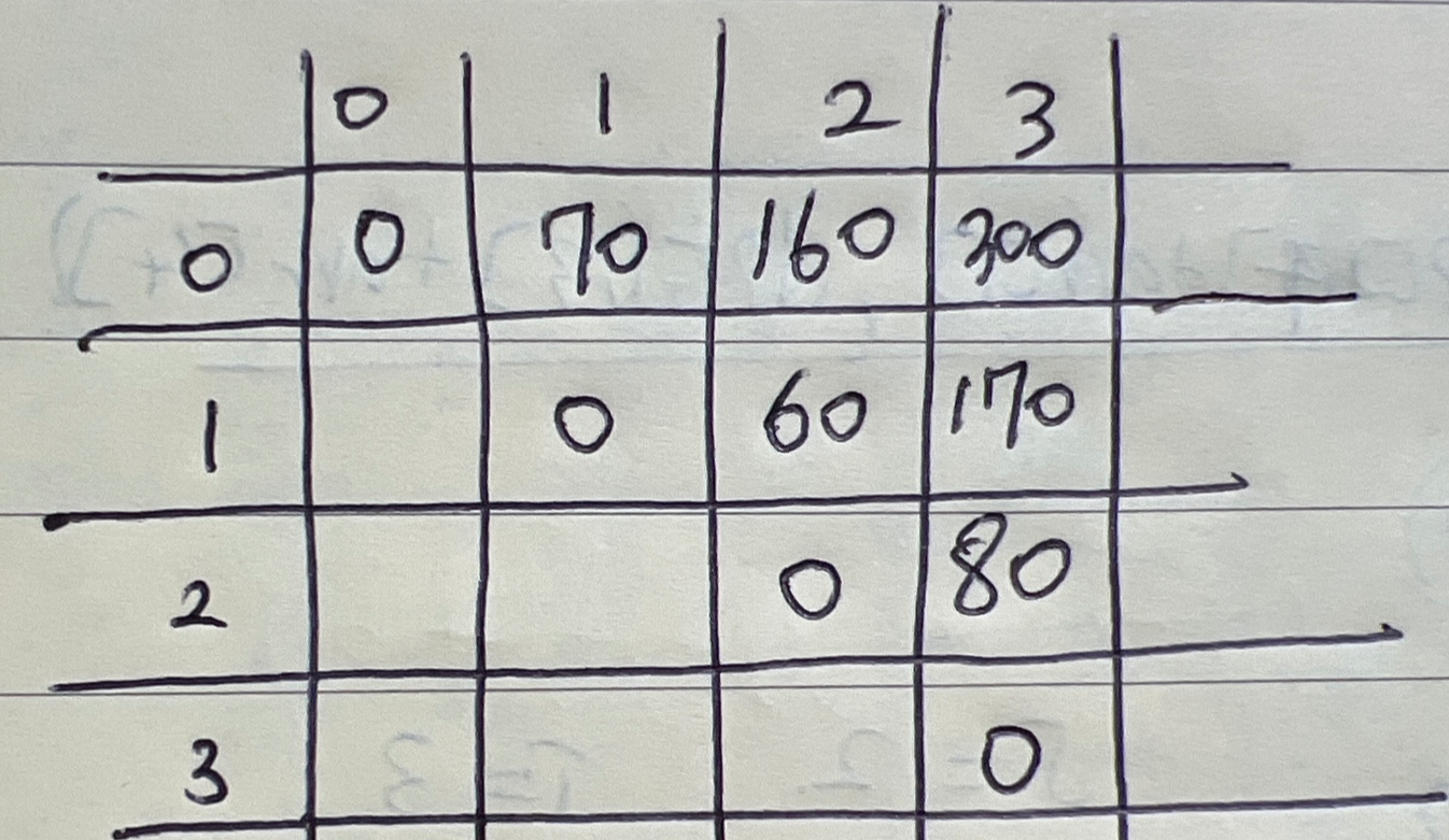 따라서 해당 문제를 메모리 제이션 할 수 있는 dp 테이블을 생성하는데 dp[i][j]는 i번째 수부터 j번째 수까지의 합을 저장하는 테이블을 작성합니다. (40,30,50) 을 구하는 과정은 dp[0][2] = min(dp[0][1] + dp[2][2], dp[0][0]+dp[1][2] ) 라는 점화식이 세워 집니다.