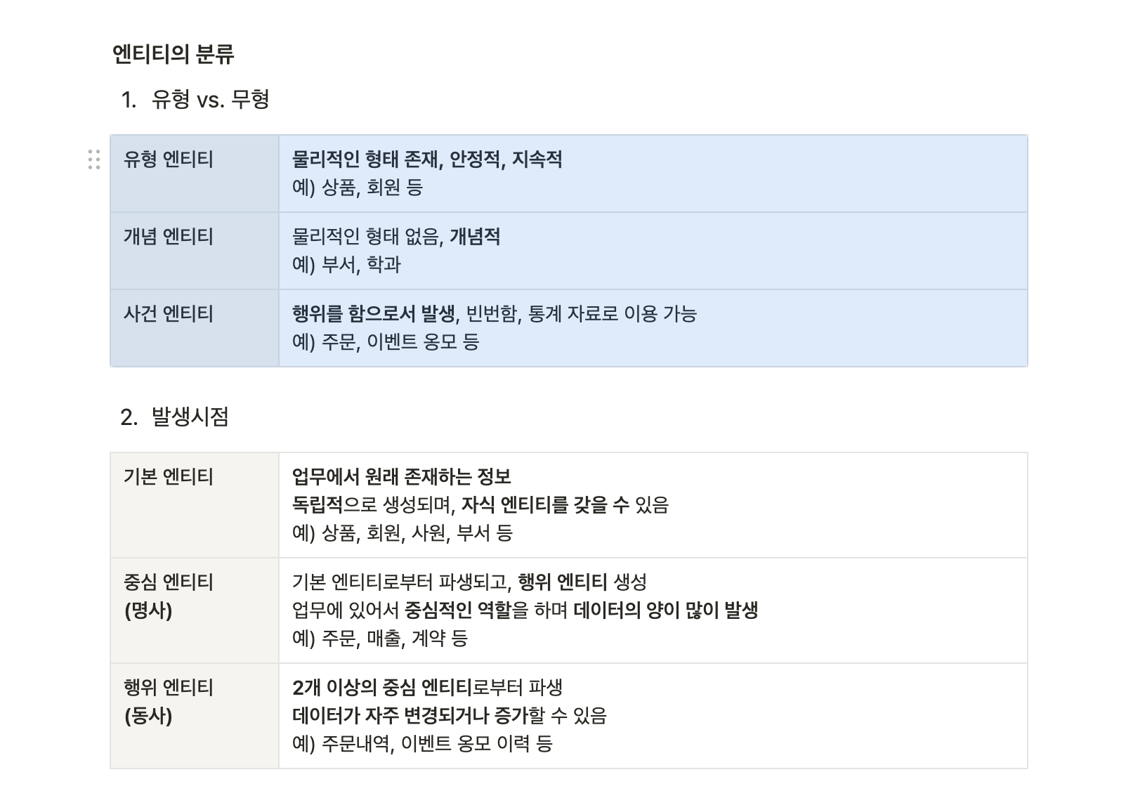쉽게 말해서 엔티티는 업무에서 쓰이는 데이터를 용도별로 분류한 그룹이라고 할 수 있다.